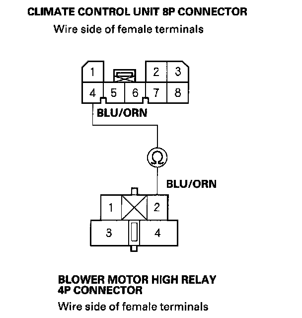 30. Check for continuity between the No.4 terminal of the climate control unit 8P connector and the No.2 terminal of the blower motor high relay 4P connector.