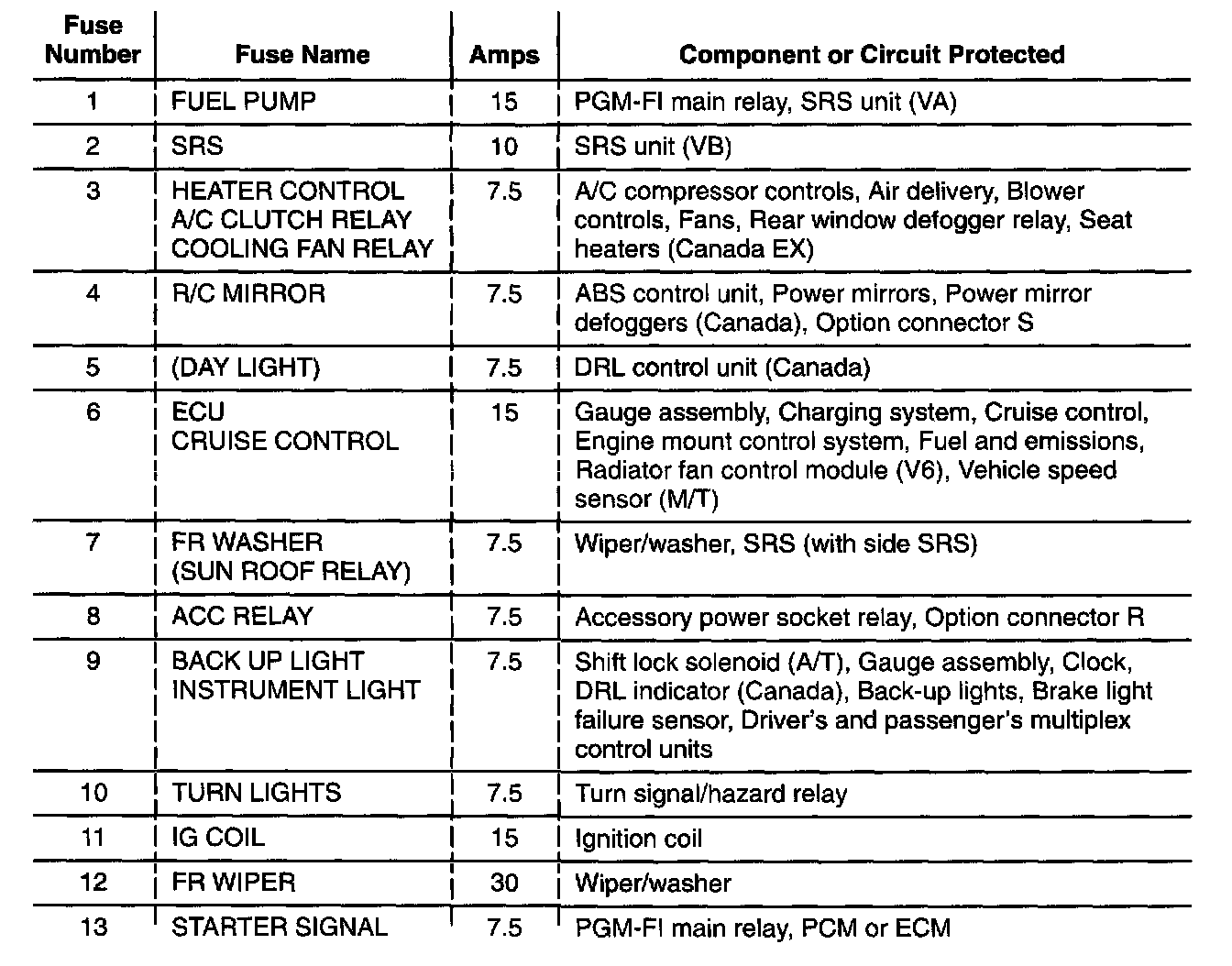 Driver's Under Dash Fuse-to-Components Index: