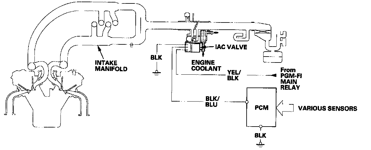 When the engine is cold, the A/C compressor is on, the transmission is in gear, the brake pedal is depressed, the P/S load is high, or the alternator is charging, the PCM controls current to the IAC valve to maintain the correct idle speed.The idle speed of the engine is controlled by the IAC (Idle Air Control) valve: