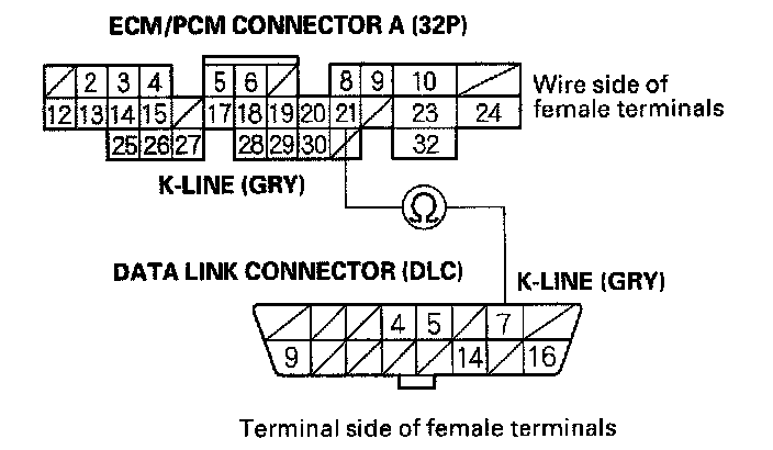 NO - Repair open in the wire between DLC terminal No.7 and the ECM/PCM (A21). After repairing the wire, check the DTC with the OBD II scan tool/Honda PGM Tester and go to the DTC Troubleshooting index.