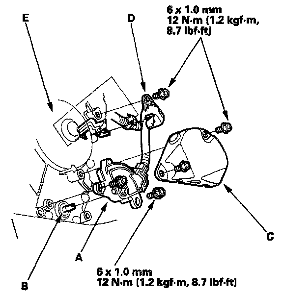10. Install the transmission range switch cover (C), and the harness clamp (D) on the end cover (E).