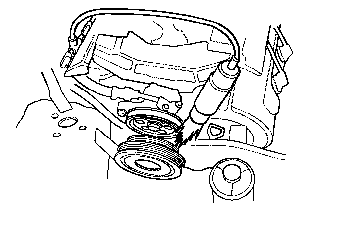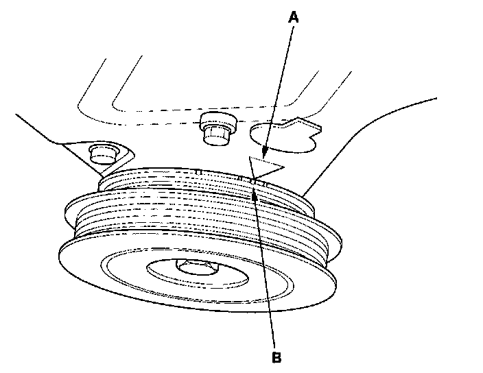 5. Point the light toward the pointer (A) on the timing belt cover. Check the ignition timing under a no load conditions: headlights, blower fan, rear window defogger, and air conditioner are not operating. If the ignition timing differs from the specification below, replace the PCM.