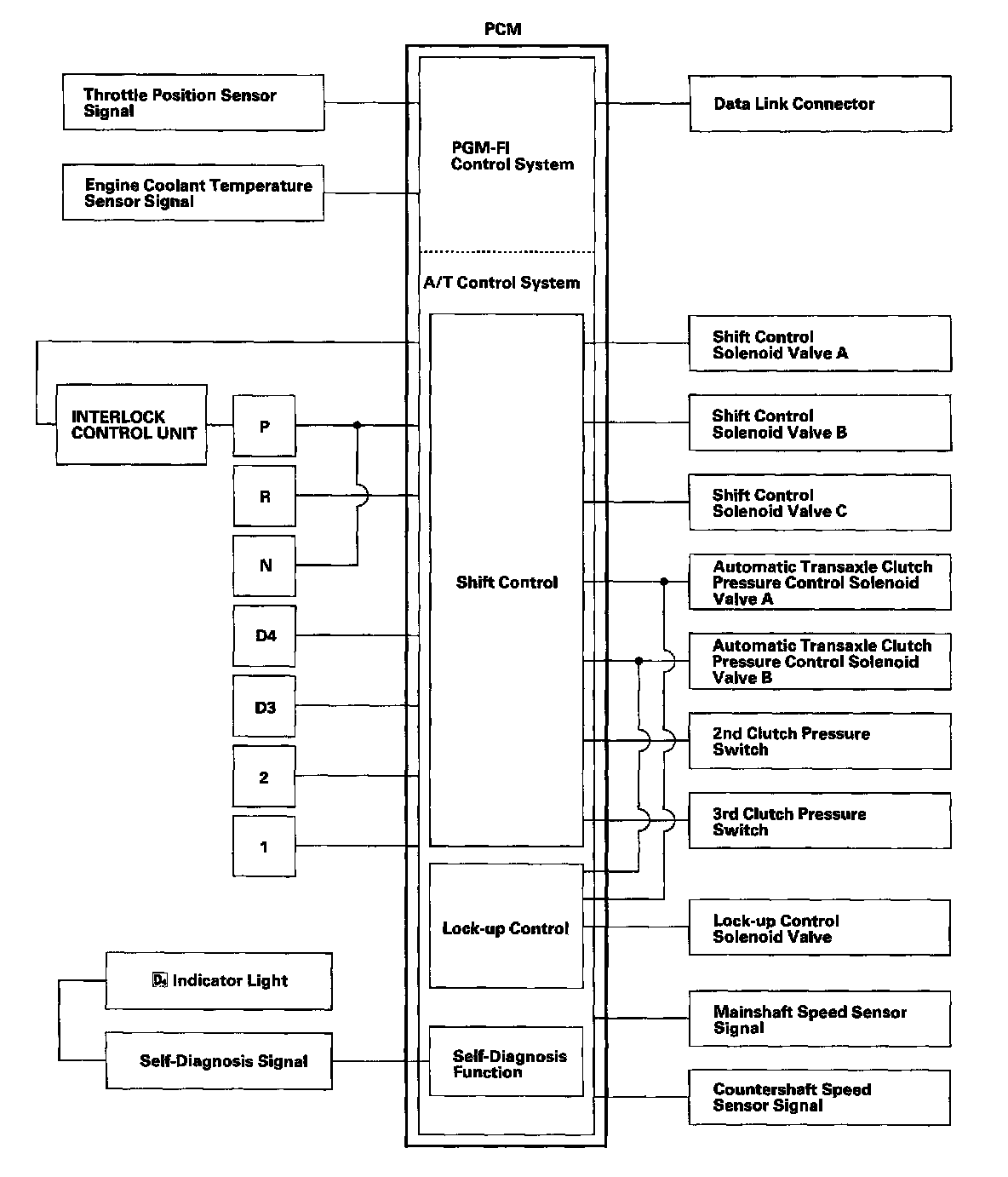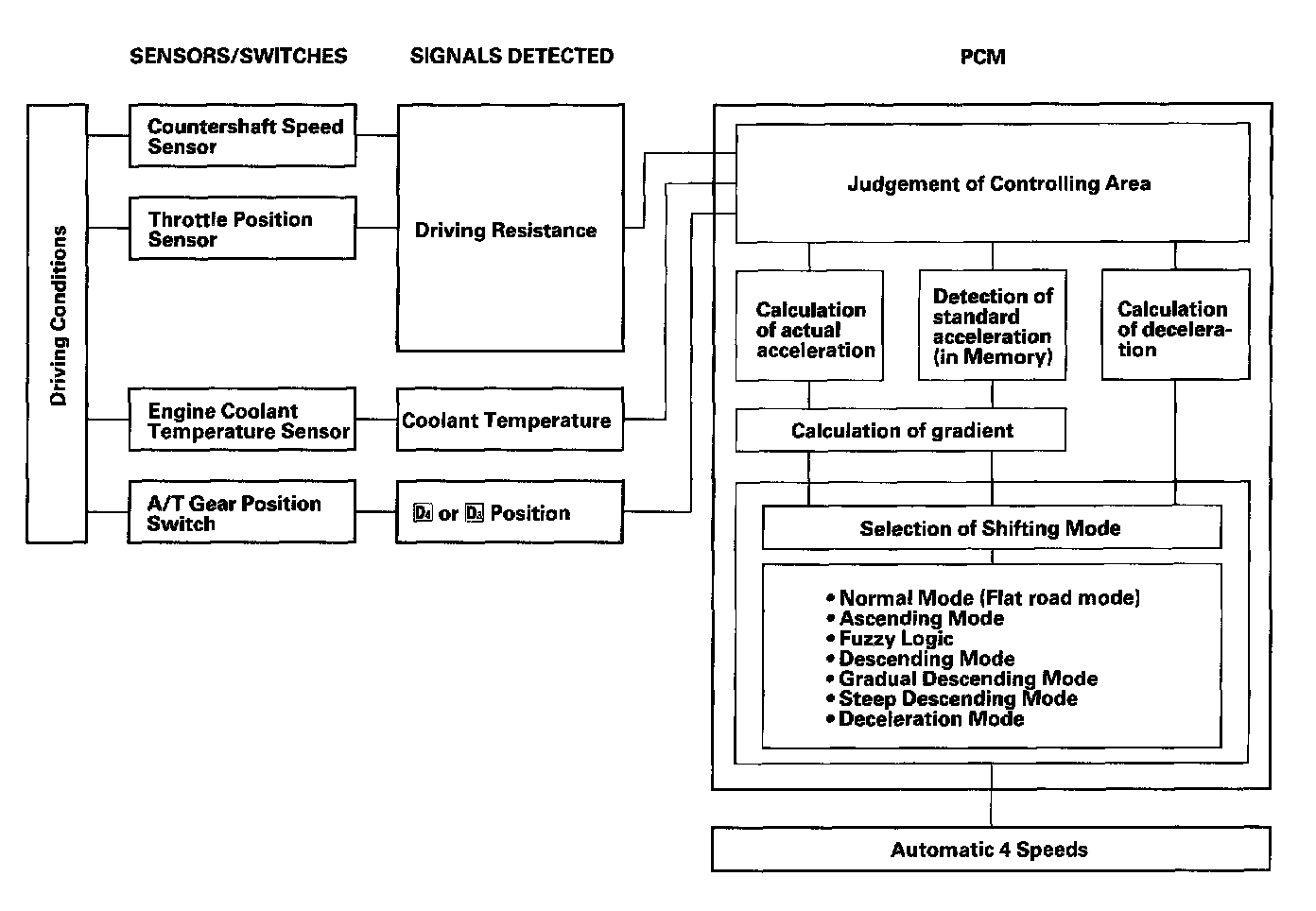 The PCM compares actual driving conditions with memorized driving conditions, based on the input from the countershaft speed sensor, the throttle position sensor, the engine coolant temperature sensor, the brake switch signal, and the shift level position signal, to control shifting while the vehicle is ascending or descending a slope, or reducing speed.