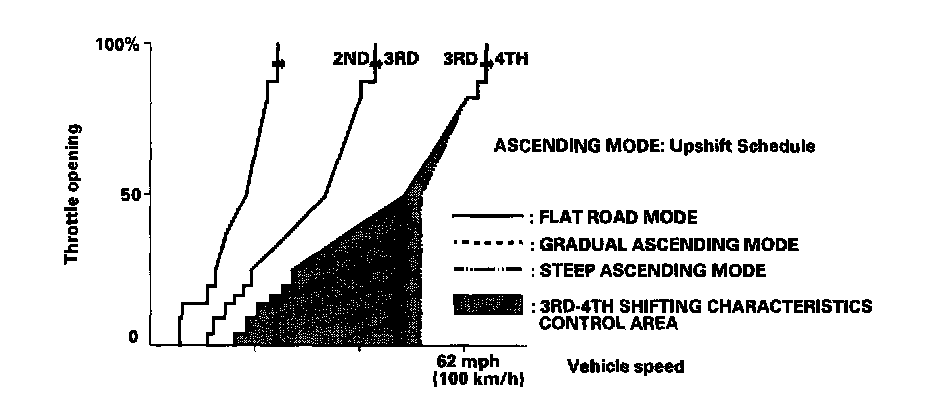 When the PCM determines that the vehicle is going down a hill in [D4] and [D3] positions, the shift-up speed from 3rd to 4th gear and from 2nd to 3rd (when the throttle is closed) becomes faster than the set speed for flat road driving to widen the 3rd gear and 2nd gear driving areas. This, in combination with engine braking from the deceleration lock-up, achieves smooth driving when the vehicle is descending. There are two descending modes with different 3rd gear driving areas and 2nd gear driving areas according to the magnitude of a gradient stored in the PCM. When the vehicle is in 4th gear, and you are decelerating when you are applying the brakes on a steep hill, the transmission will downshift to 3rd gear. When you accelerate, the transmission will then return to higher gear.
