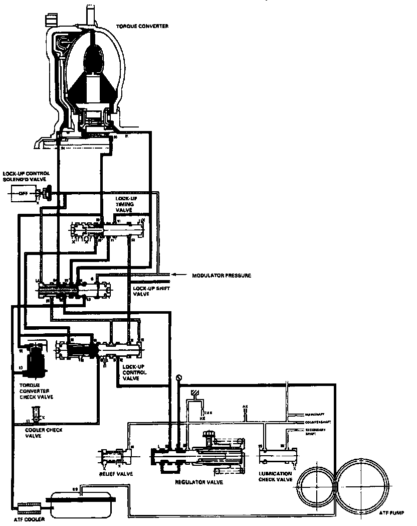 With the lock-up clutch on, fluid in the chamber between the torque converter cover and the lock-up piston is drained off, and the converter fluid exerts pressure through the piston against the torque converter cover. As a result, the converter turbine is locked to the converter cover. The effect is to bypass the converter, placing the vehicle in direct drive.
