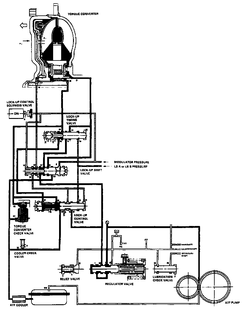 When the vehicle speed further increases, the PCM controls A/T clutch pressure control solenoid valves A and B to increase LS A or LS B pressure (58). The LS A or LS B pressure (58) is applied to the lock-up control valve and the lockup timing valve, and moves them to the left side. Under this condition, torque converter back pressure (F2) is released fully, causing the lock-up clutch to be fully engaged.
