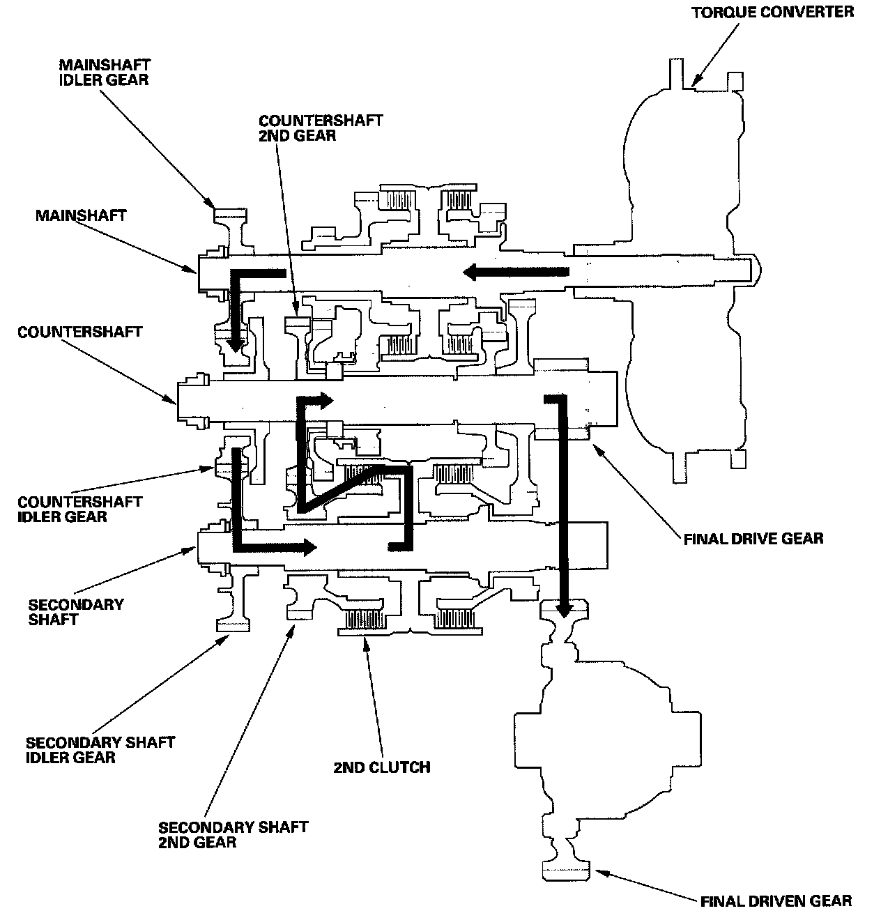 - The mainshaft idler gear drives the secondary shaft via the countershaft idler gear and secondary shaft idler gear.
