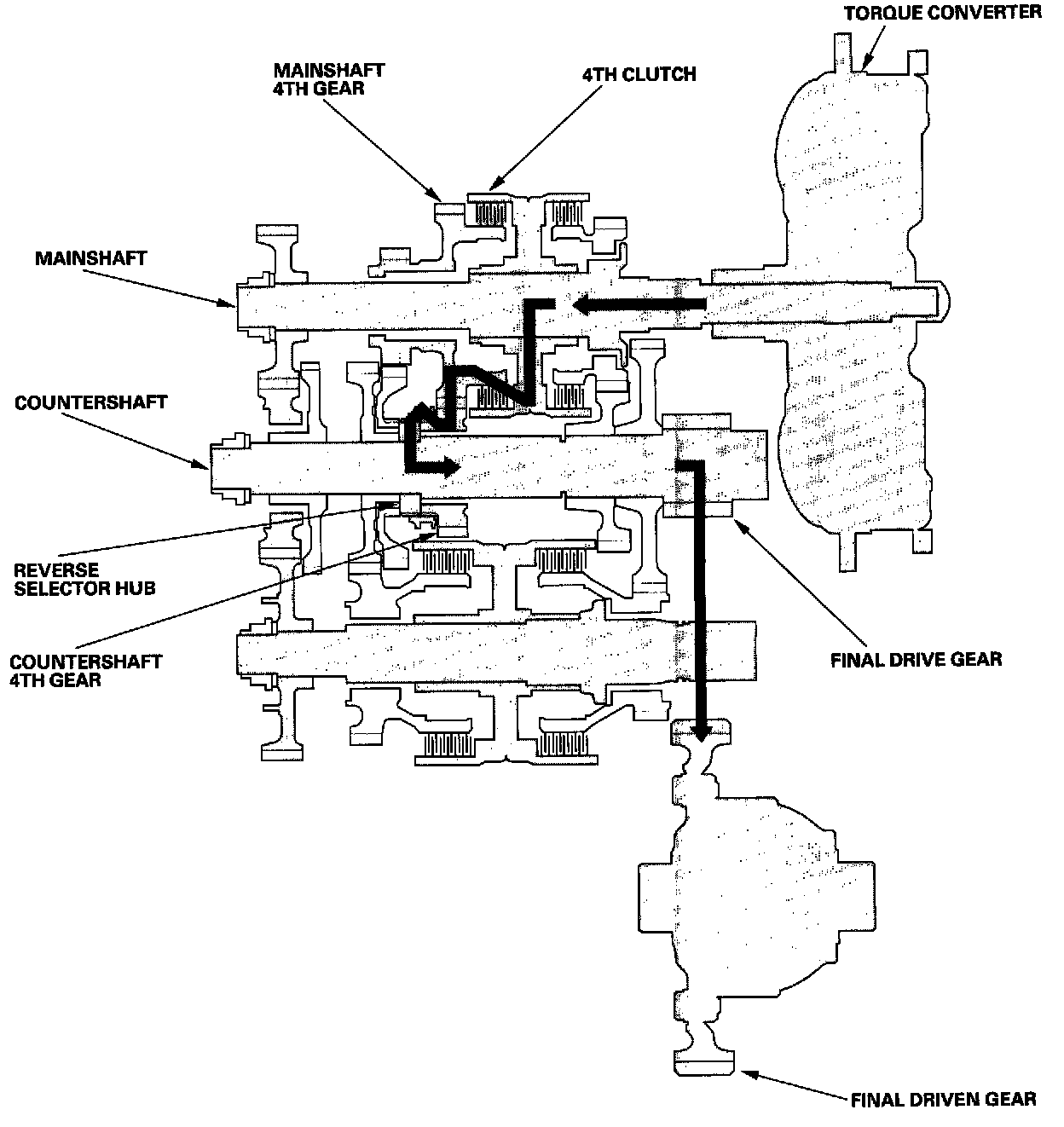 - The mainshaft 4th gear drives the countershaft 4th gear, which drives the reverse selector hub and the countershaft. Power is transmitted to the final drive gear, which in turn drives the final driven gear.