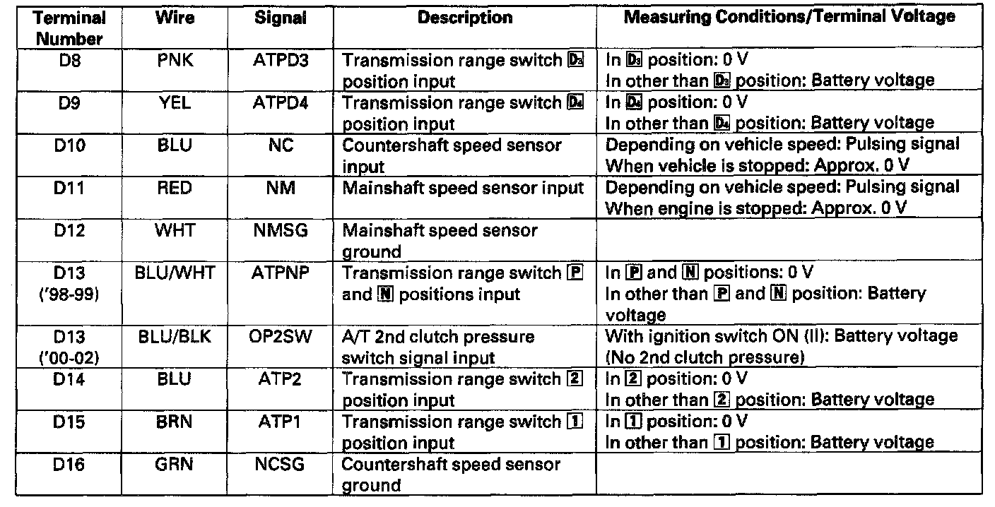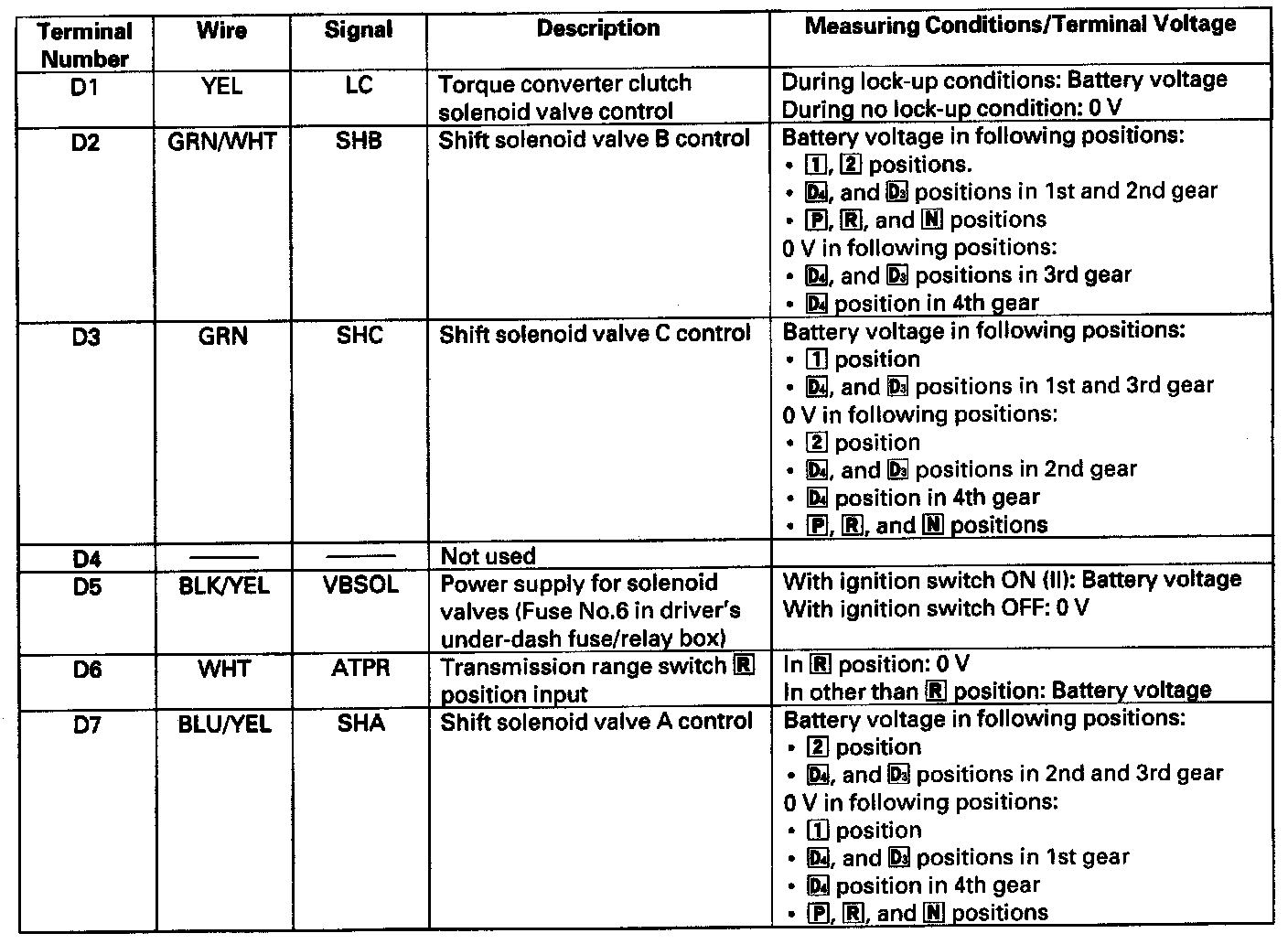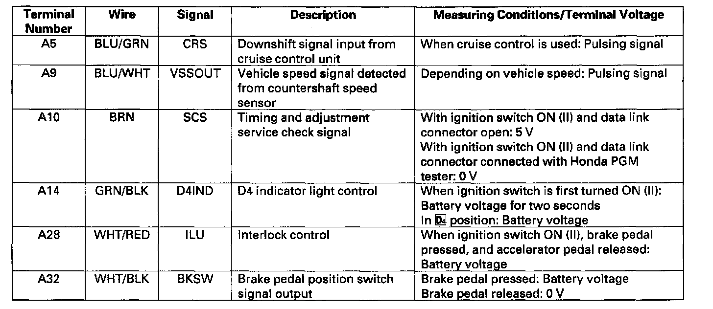 PCM Inputs and OutputsThe PCM terminal voltage and measuring conditions are shown for the connector terminals related to the A/T control system. The other PCM terminal voltage and measuring conditions are described.