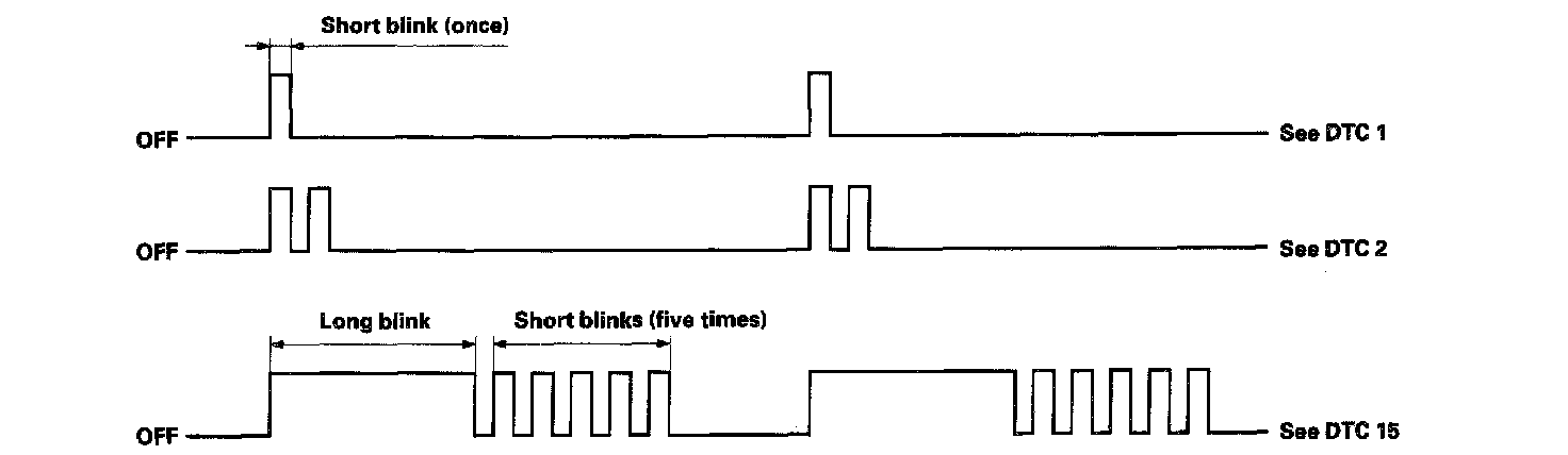 Codes 1 through 9 are indicated by individual short blinks. Codes 10 and above are indicated by a series of long and short blinks. One long blink equals 10 short blinks. Add the long and short blinks together to determine the code. After determining the code, refer to the DTC Troubleshooting Index. Testing and Inspection