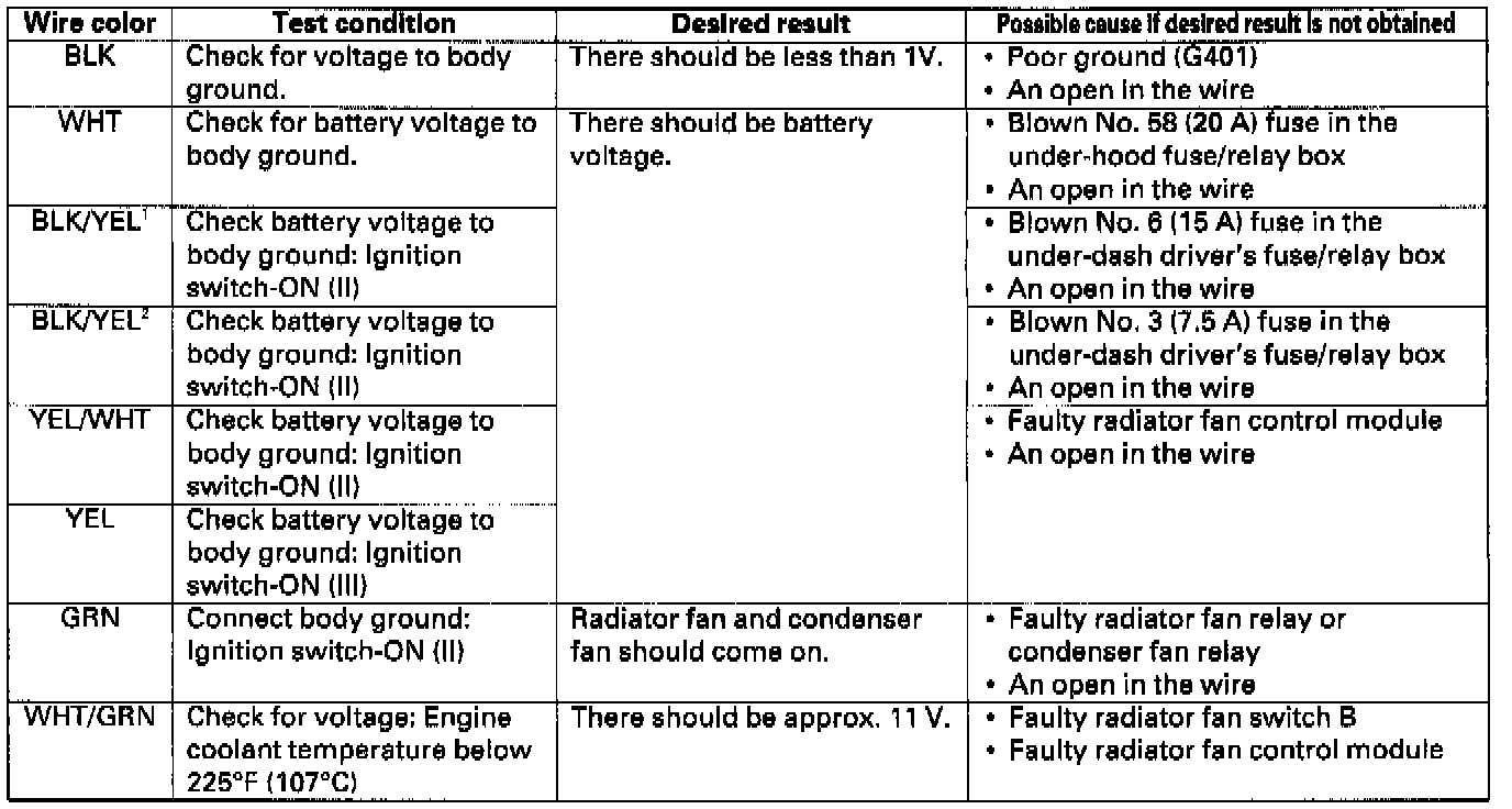 Perform the tests with the radiator fan control module 8P connector connected, the ignition switch ON (II) and the A/C switch OFF.