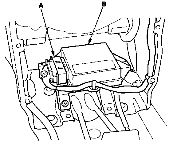 4. Disconnect the SRS main harness 18P connector (A) from the SRS unit (B).