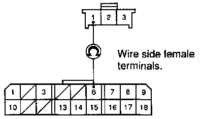 32. Check resistance between the No. 6 terminal of the SRS main harness 18P connector and No. 1 terminal of the SRS main harness 3P connector; there should be 0 - 1.0 Ohm