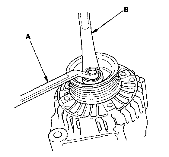 3. If the front bearing needs replacing, remove the pulley locknut with a 10 mm wrench (A) and a 22 mm wrench (B). If necessary, use an impact wrench.