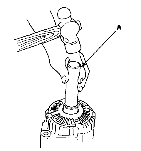 16. Support the stator housing in a vise, and drive out the front bearing with a brass drift (A) and hammer.