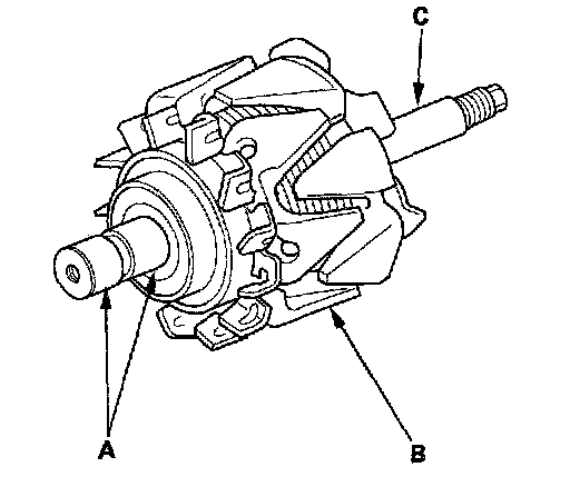 21. Then check that there is no continuity between each slip ring (A) and the rotor (B) and the rotor shaft (C).