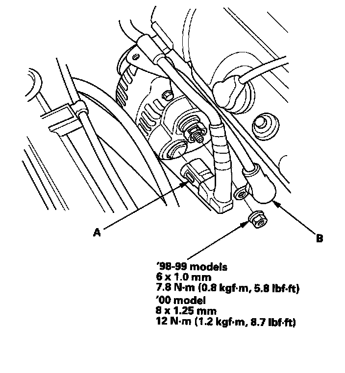 6. Disconnect the 4P connector (A) and BLK wire (B) from the alternator.