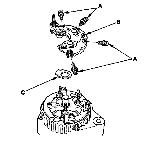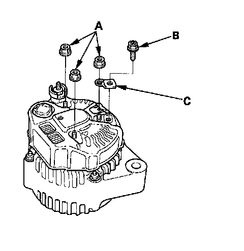 4. Remove the three flange nuts (A) and the screw (B) from the alternator, then remove the plate terminal (C).