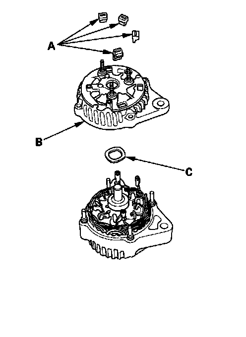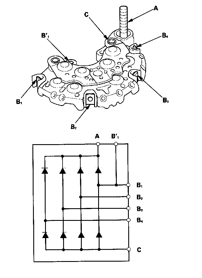 18. Check for continuity in each direction, between the B terminal (A) and P terminals (B), and between the E terminal (C) and P terminals (B) of each diode pair. All diodes should have continuity in only one direction. Because the rectifier diodes are designed to allow current to pass in one direction, and the rectifier is made up of eight diodes (four pairs), you must test each diode in both directions for continuity with an ohmmeter that has diode checking capability: a total of 16 checks.