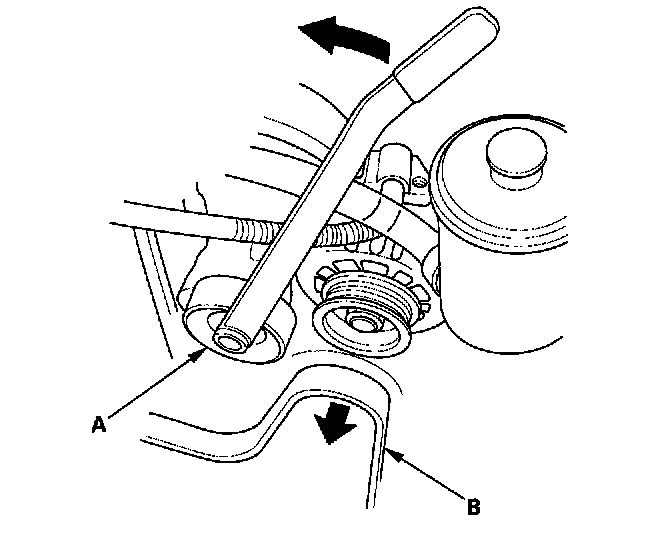 2. Move the auto-tensioner (A) to relieve tensioner from the alternator belt (B), and remove the alternator belt.
