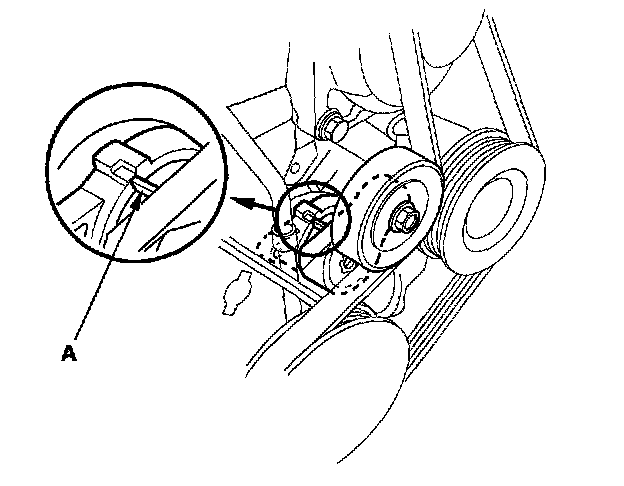 1. Check the position of the auto-tensioner indicator's pointer (A), start the engine, then check the position of the pointer again. If the position changes, go to step 5.