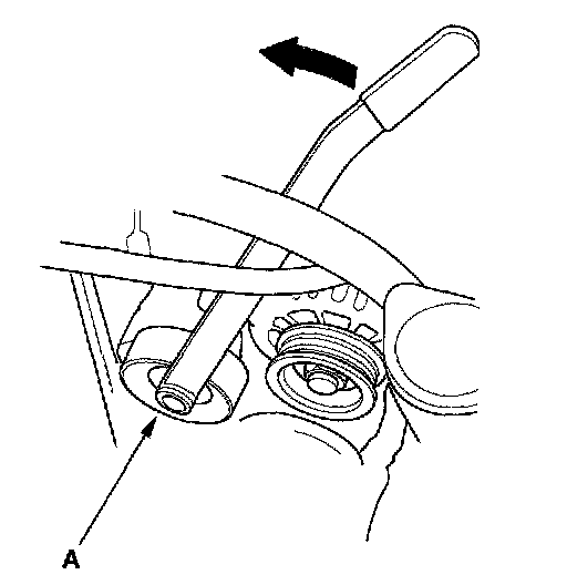4. Check if the auto-tensioner (A) moves smoothly and check for abnormal noise when the pulley is turned counterclockwise with the designated tool. If the auto-tensioner does not move smoothly or if the there is abnormal noise. Replace the auto-tensioner. Do not move the auto-tensioner beyond its limit.