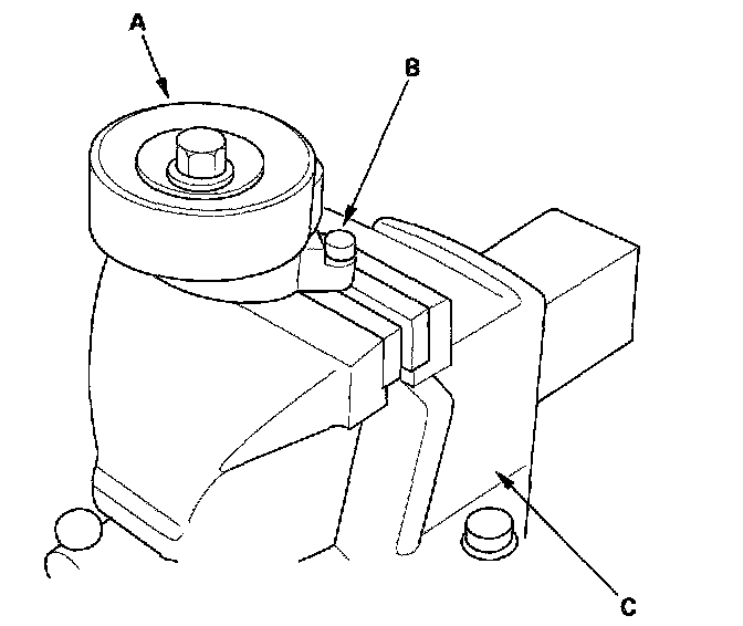 6. Clamp the auto-tensioner (A) by using two 6 mm bolts (B) and vise (C) in a vise as shown. Do not clamp the auto-tensioner itself.