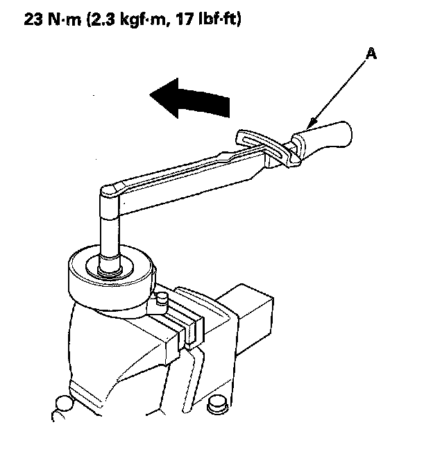 7. Attach a torque wrench (A) to the pulley bolt. Measure the torque when the tensioner is turned counterclockwise. If the torque is less than specified value, replace the auto tensioner.
