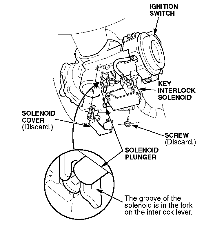 1. Remove and discard the plastic solenoid cover from the ignition switch key interlock solenoid.2. Note the position of the interlock solenoid plunger; you'll need to reinstall it the same way.