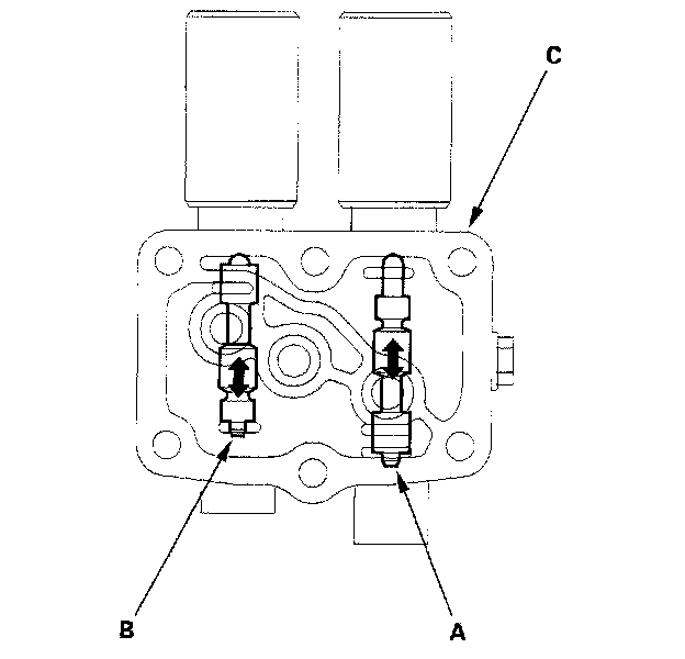 Note: You can see the valve movement through the fluid passage in the mounting surface of the A/T clutch pressure control solenoid valves A and B body (C).