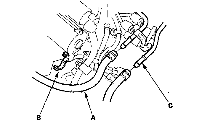 9. Remove the ATF cooler hoses (A) from the ATF cooler lines (C). Turn the ends of the ATF cooler hoses up to prevent ATF from flowing out, then plug the ATF cooler hoses and lines.