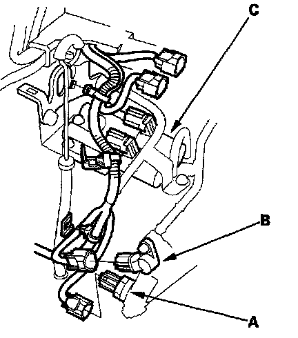 13. Disconnect the connectors from the 3rd clutch pressure switch (A), mainshaft speed sensor (B), and A/T clutch pressure control solenoid valves A and B (C), then remove the harness clamps from the clamp brackets.