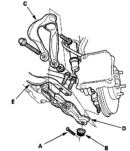 23. Remove the bolts securing the radius rods (E), then separate the radius rods from the lower arms (D).