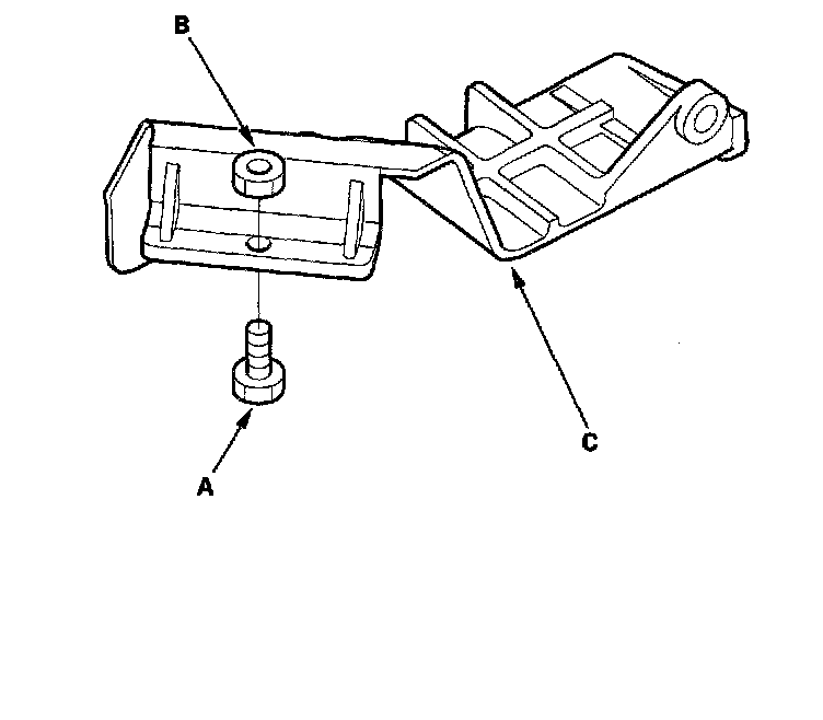 35. Install a 6 x 1.0 x 14 mm bolt (A) and nut (B) on the shift cable cover (C), then reinstall the shift cable cover to the torque converter housing. (The torque converter may stay on the engine, and the bolt head will support the torque converter, when the transmission is removed.)