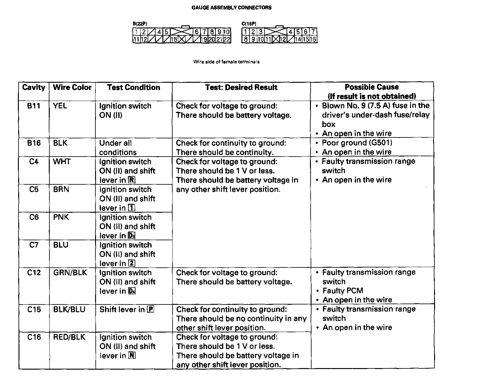 - If the terminals look OK, make the following input tests at the gauge assembly B (22P) and C (16P) connectors.