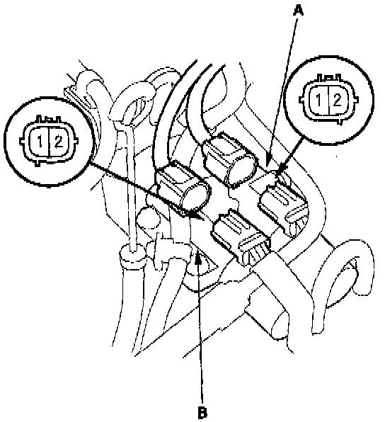 2. Measure the resistance of the A/T clutch pressure control solenoid valves A and B between the No.1 and No.2 terminals of each connector.