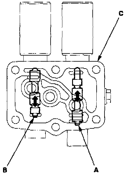 NOTE: You can see the valve movement through the fluid passage in the mounting surface of the A/T clutch pressure control solenoid valves A and B body (C).
