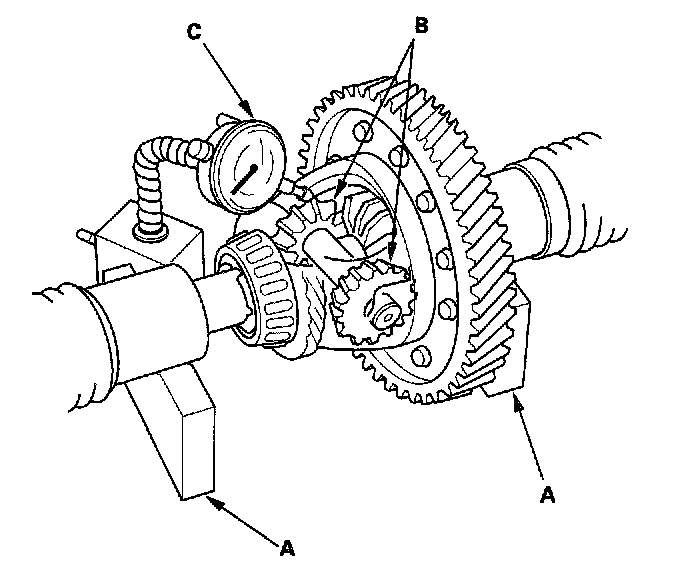 2. Measure the backlash of both pinion gears (B) with a dial indicator (C). If the backlash is not within the standard, replace the differential carrier.