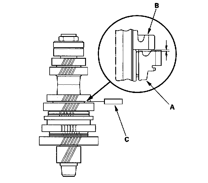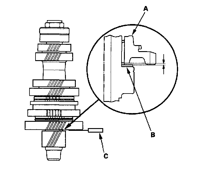 Inspection1. Measure the clearance between the 1st gear (A) and the thrust washer (B) with a feeler gauge (C). If the clearance is more than the service limit, go to step 2.