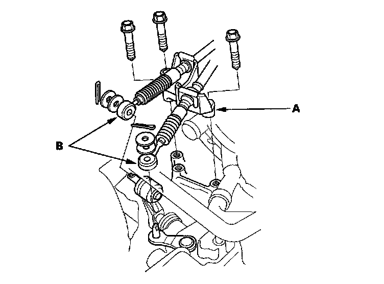 5. Carefully remove the slave cylinder (A) and clutch line clamp (B) so as not to bend the clutch line. Do not operate the clutch pedal once the slave cylinder has been removed.