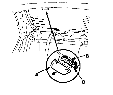 4. Remove the window antenna terminal cover (A) from the window antenna terminal base (B), and disconnect the window antenna connector (C).