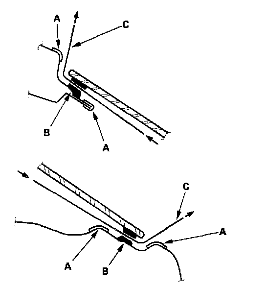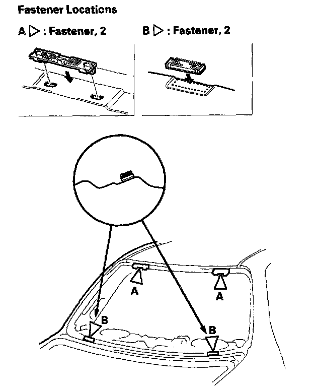 14. Glue the fasteners (A, B) to the inside face of the rear window as shown. If necessary, apply primer (3M N-200, or equivalent) to the areas where the window antenna terminal base (C) will be glued, then glue the base on: