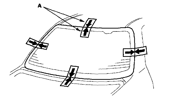 19. Set the rear window in the opening, and center it. Make alignment marks (A) across the rear window and body with a grease pencil at the four points shown. Be careful not to touch the rear window where adhesive will be applied.