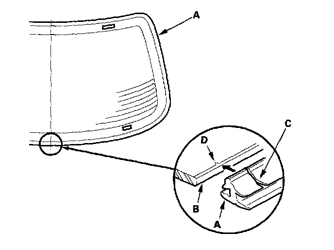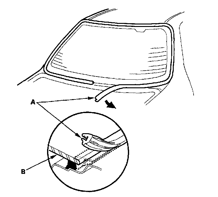 6. Remove the molding (A) from the edge of the rear window (B). If necessary, cut the molding with a utility knife.
