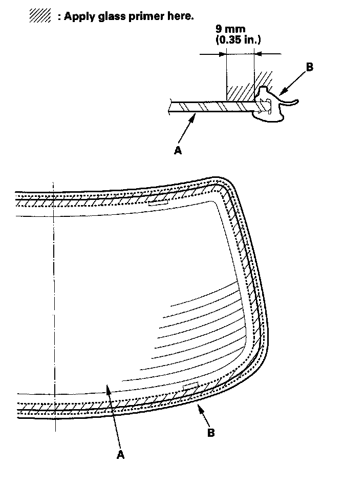 21. With a sponge, apply a light coat of glass primer along the edge of the rear window (A) and molding (B) as shown, then lightly wipe it off with gauze or cheesecloth: