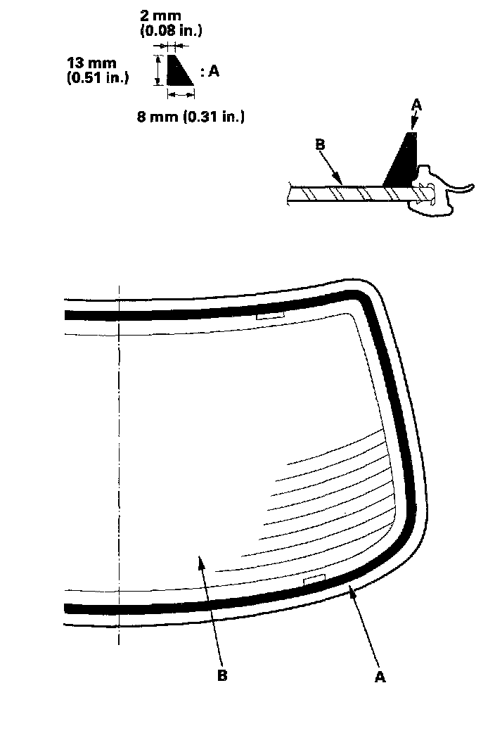 25. Pack adhesive into the cartridge without air pockets to ensure continuous delivery. Put the cartridge in a caulking gun, and run a bead of adhesive (A) around the edge of the rear window (B) as shown. Apply the adhesive within 30 minutes after applying the glass primer. Make a slightly thicker bead at each corner.