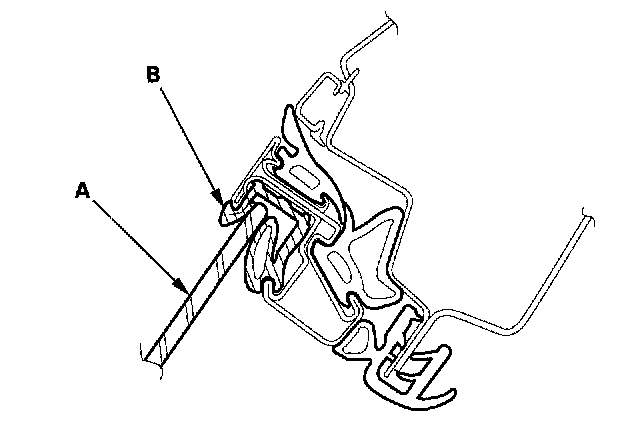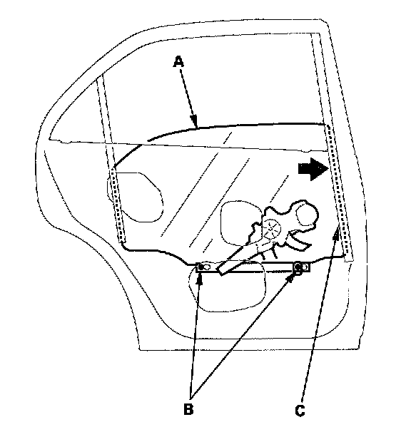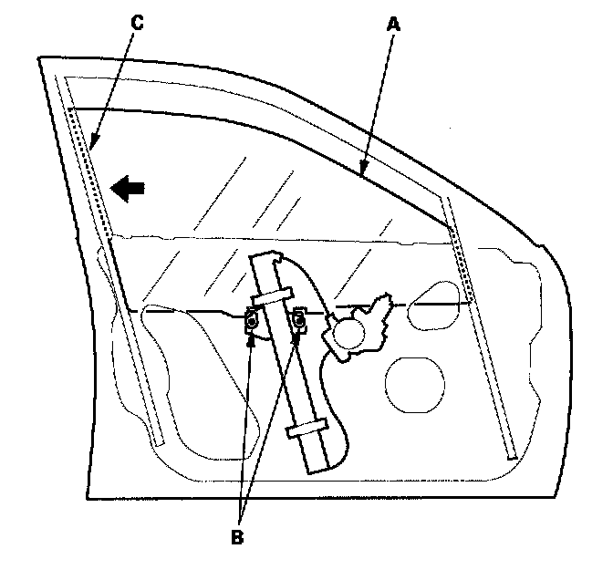6. Raise the glass fully, and check for gaps. Check that the glass (A) contacts the glass run channel (B) evenly.