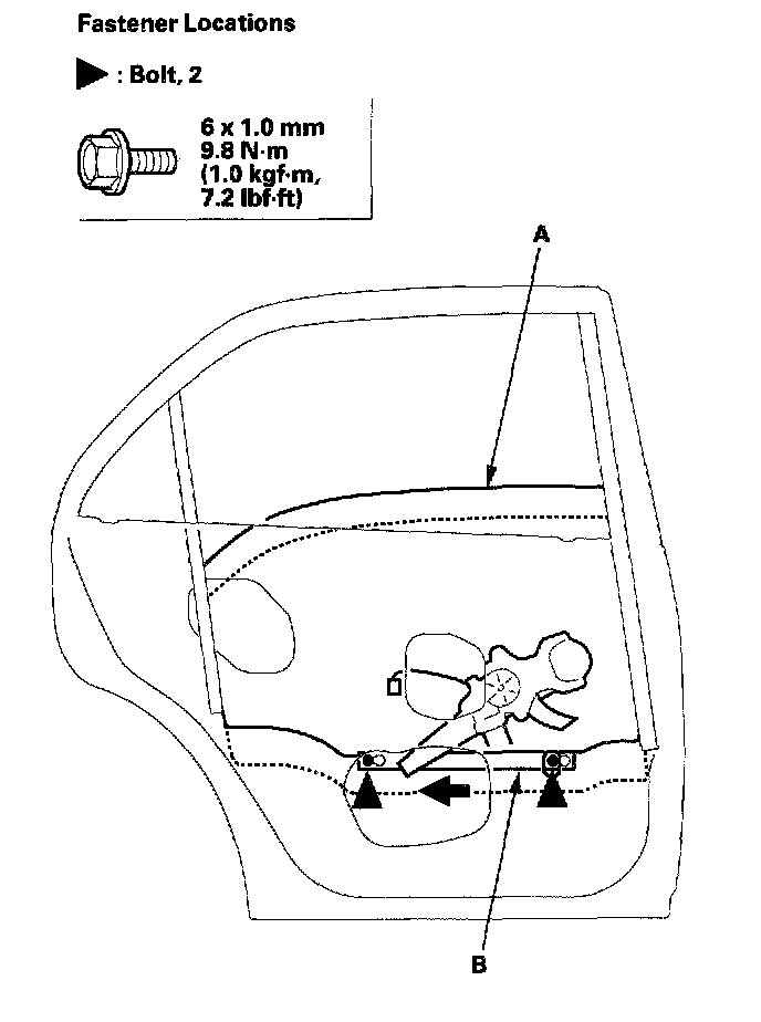 2. Carefully move the glass (A) until you can see the bolts, then loosen them. Slide the guide (B) to the rear, then remove the glass from the guide, and carefully lower the glass. Take care not to drop the glass inside the door.