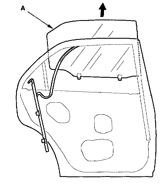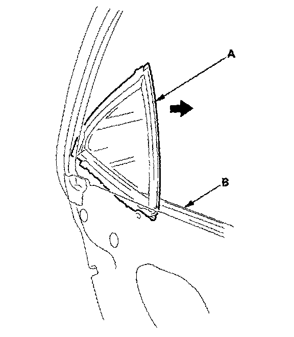 6. Remove the quarter glass (A). Take care not to damage the door molding (B).