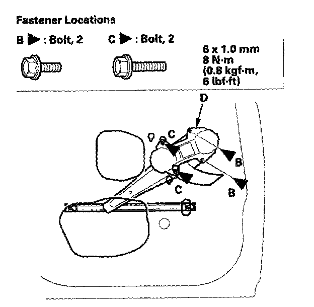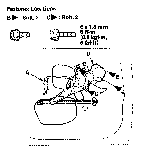 7. Disconnect and detach the connector (A) from the door (Power window models). Remove the bolts (B), and loosen the bolts (C), then remove the regulator (D) through the hole in the door.
